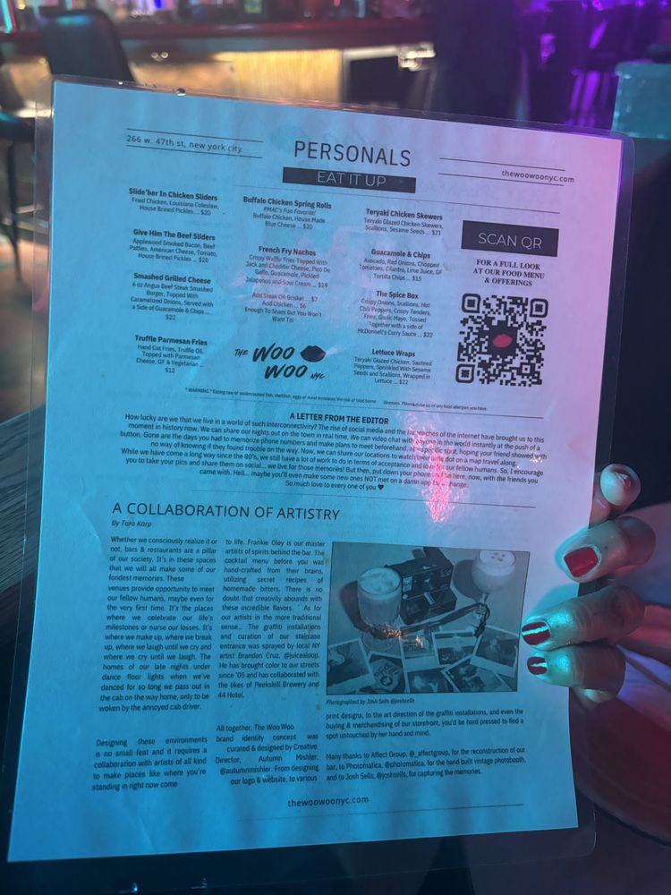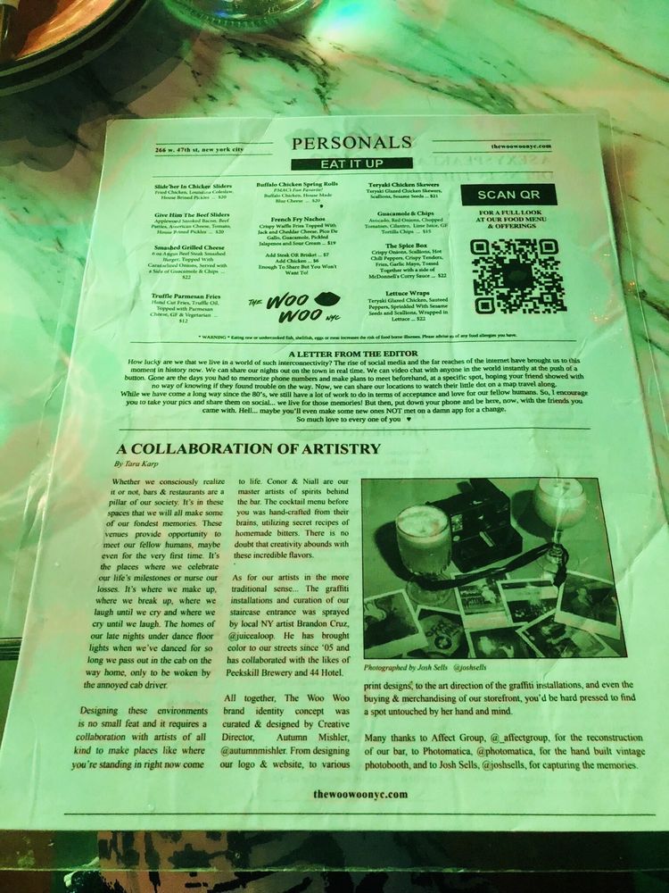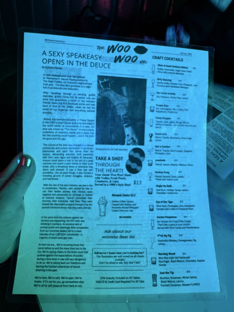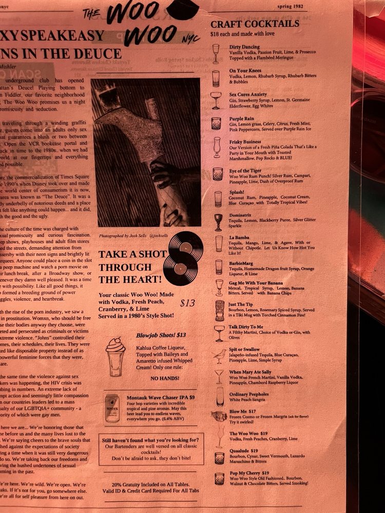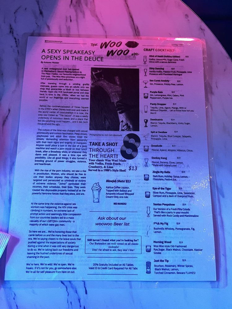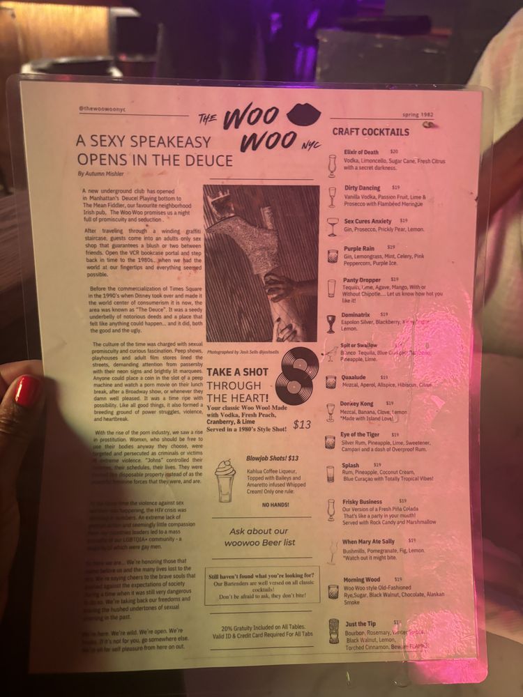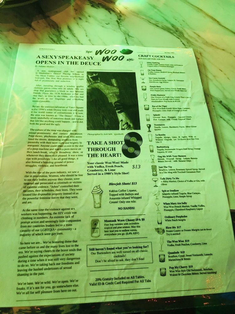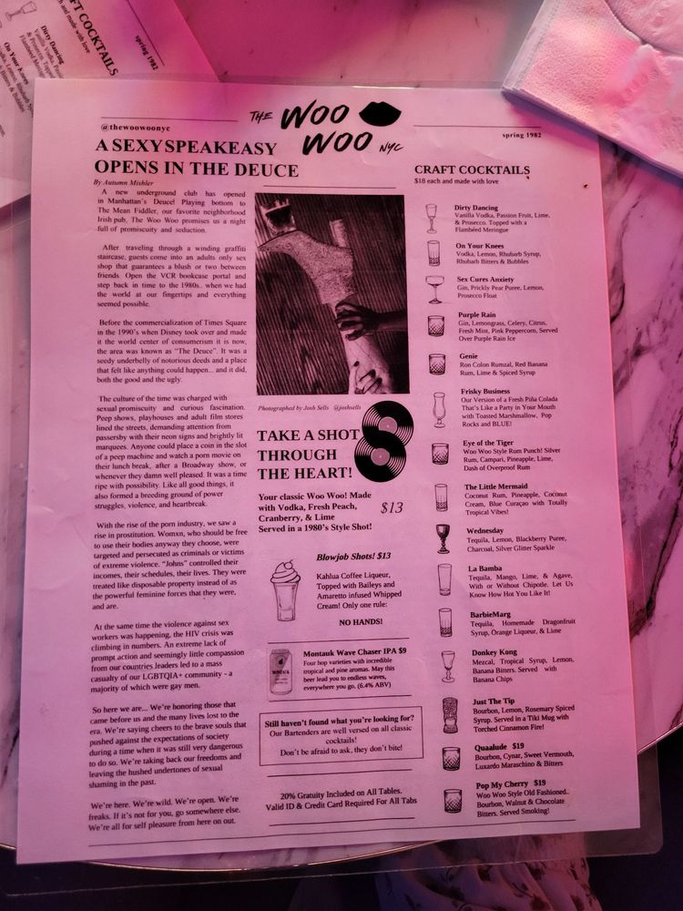 “ A friend and I planned a date night and wanted to go somewhere we've never been before. Knowing I like speakeasy's my friend recommended we try The Woo Woo. Located right next to The Mean Fiddler, we walked up to a bouncer in all black who asked for the password to enter The Woo Woo. Once given, he asked for our ID and pressed the buzzer. The person who answered also asked for the password and once we said it, they let us in. The inside was well lite and completely full of graffiti. You have to go down two flights of stairs and when you get to the bottom you entered into a very small porn shop. It felt like you stepped into the 80s/early 90s. We had the option to take photos and look around and then the hostess told us how to enter the actually bar itself. Once in, we were meet with an 90's style bar with multiple TVs playing shows from that era. My friend and I sat closer to the bar; I was facing a TV playing The Fresh Prince and my friend was facing the TV that played Sex In the City. The music was also from the 90's. It was a cool vibe. The drinks and food have funny, sexual names and we ordered a few things. For drinks, I ordered Sex Cures Anxiety, which was a spin on a French 75. I thought it was tasty but just a little too sweet. My friend ordered Morning Wood. For food we ordered the Slide'her In Chicken Sliders and the French Fry Nachos. The sandwiches were good, you get three per serving and the nachos were spicy and delicious. Overall, I enjoyed it and could see how it would be a fun spot to hang with friends. It didnt give me the "speakeasy" vibe I was looking for. It was very 90s and kinda give me Stranger Things era. ”